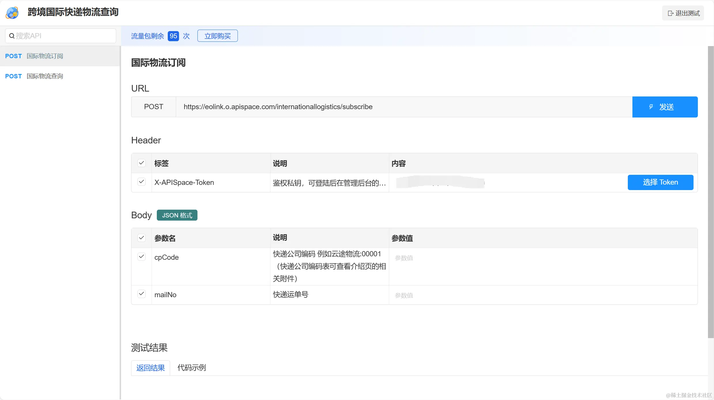 点击【测试API】按钮,进入测试页可在线查询物流信息。