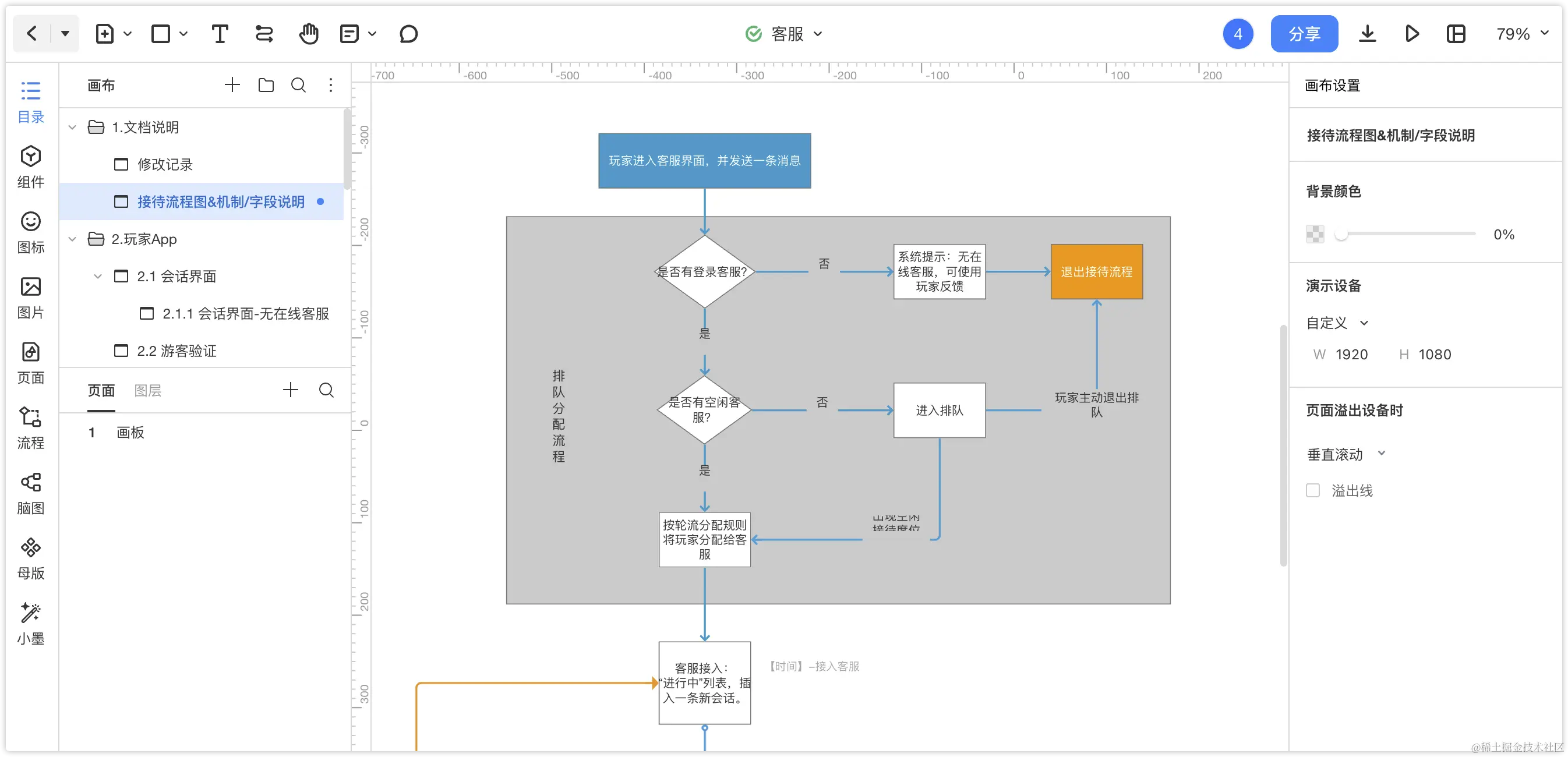 3、文档说明:摹客RP在这一块的表现也还不错,但能够保留Axure中备注撰写方式,对我个人而言也有吸引力。流程图的绘制方式比Axure要完善一些,支持拖拽连接线快速创建图层,绘制效率有所提升。