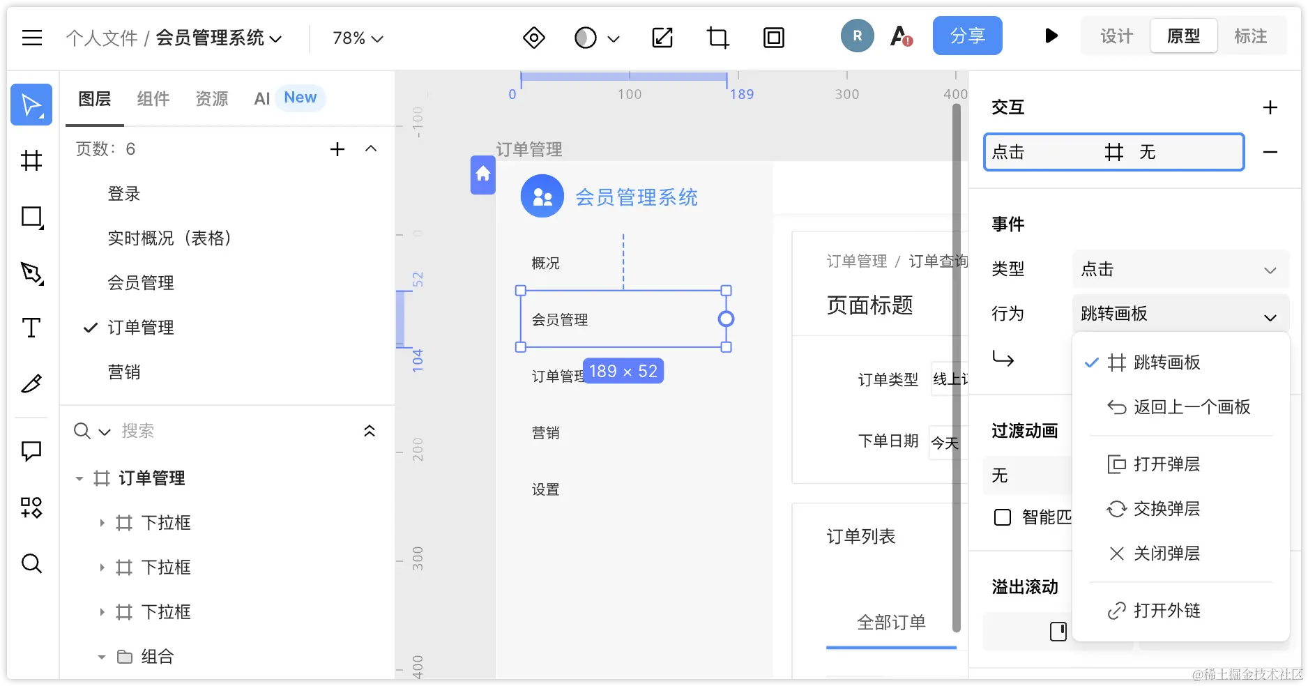 还是先说说3款Figma系的工具,Pixso、即时设计可以算是完全丢掉了Axure中的交互设置,连页面跳转效果都没有保留;而Mastergo则也只保留基础的页面跳转设置。这主要是因为,这三款以UI能力为主的设计工具,他们的交互功能与Axure存在的区别过大。