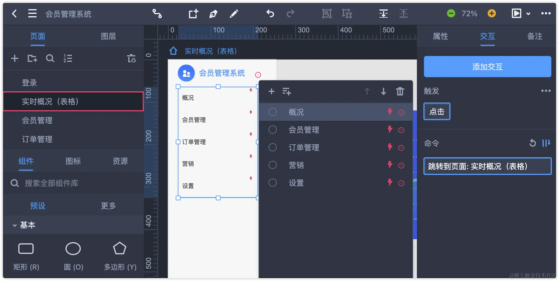 1、界面设计:摹客RP的预设组件库是一个较大的亮点,提供的组件比Axure要丰富不少,并且所提供的交互特性也更加完善。尤其是其提供的统计地图、仪表盘等图表类组件,易用程度超出我的预期。此外,完善的属性样式设置,搭配图标库、钢笔工具及官方项目模板,能够很快完成界面设计效果,综合体验比Axure要好。