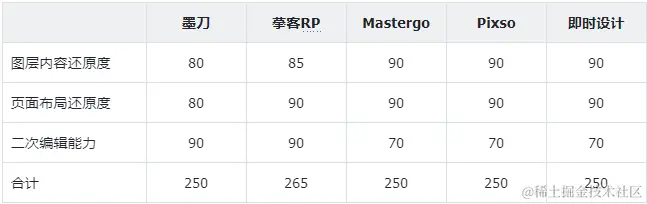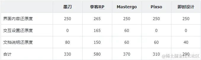 也就是说,如果一款工具对Axure项目的还原度不够,那它大概率很难支撑我的后续设计工作。接下来,我就按照这两点测评标准,对上面5款设计工具的测评结果进行梳理。