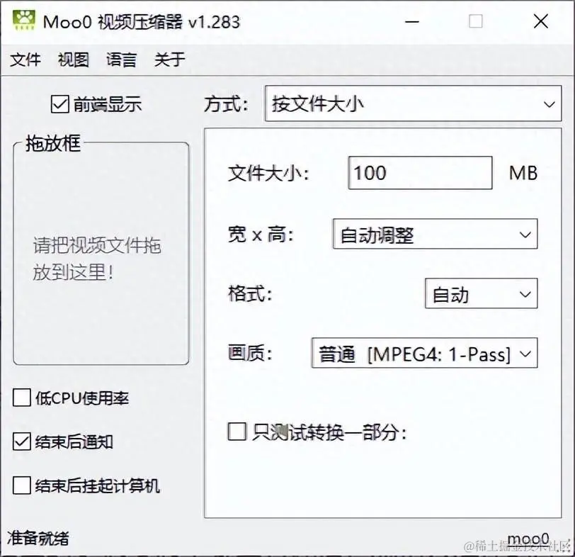 Moo0 VideoMinimizer是一款绿色免安装的视频压缩工具,它可以让你轻松地减小视频文件的大小。你只需要在软件里设置压缩方式和文件大小,然后把视频拖入左边的拖放框里即可。软件支持多种压缩方式和视频格式,如AVI、FLV、MKV、MP4等。你还可以选择只转换视频的一部分,以预览压缩效果。Moo0 VideoMinimizer是一款适合经常处理视频的朋友使用的软件、