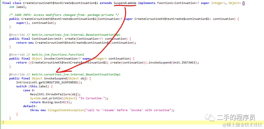 其中 suspend()->T 是 createCoroutine 函数的宿主,也就是使用了扩展函数,需要一点 kotlin 的语法知识。我们能在一个 suspend {} 这样一个东西上调用该方法就是因为这种写法了。