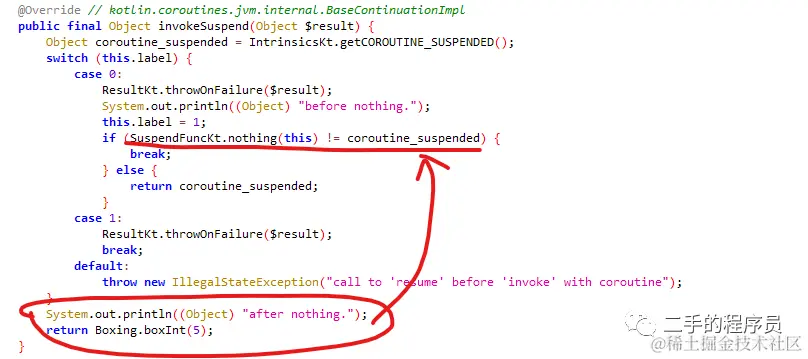 而且最妙的地方在于,我们的 PCB,也就是 suspenc {} 被编译器改写成了 switch case 的方式。为啥要这样呢?前面说过了,挂起函数会将 PCB 分成好几个块,所以每一个块的逻辑会对应一个 case,如此这般,这般如此,协程运行时的流程就出来了。