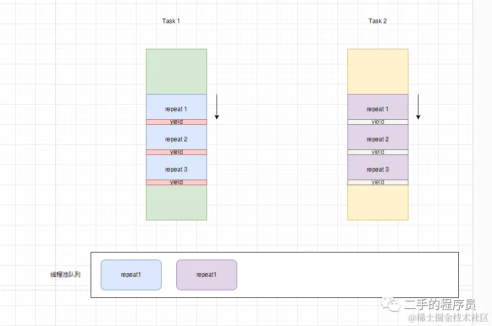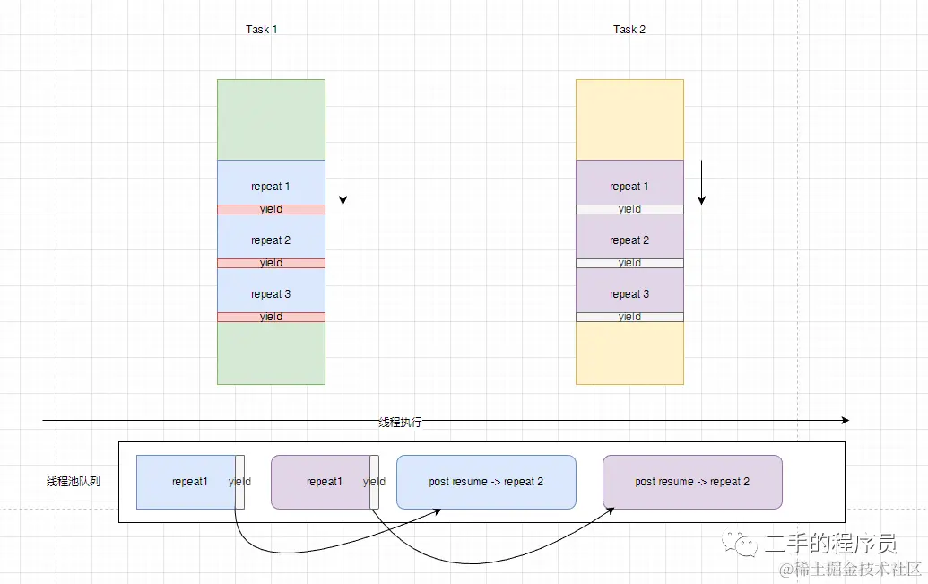 再看 yield 的逻辑,追踪一下发现它只是往线程池里面 post 了一个 runnable,而 runnable 会调用 resume,resume 会导致程序执行下一个切片的片段,也就是 repeat 2,如下图: