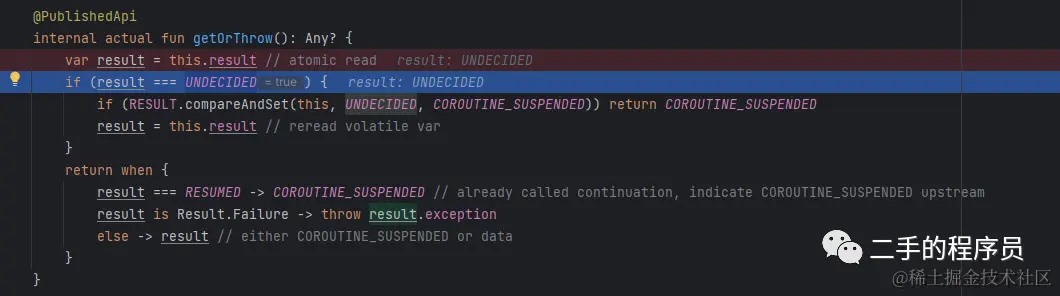 巧就巧在,resume 方法会改变 result 的值为 996,从而导致 getOrThrow 的返回值变成 996,也就是说协程不会挂起。
