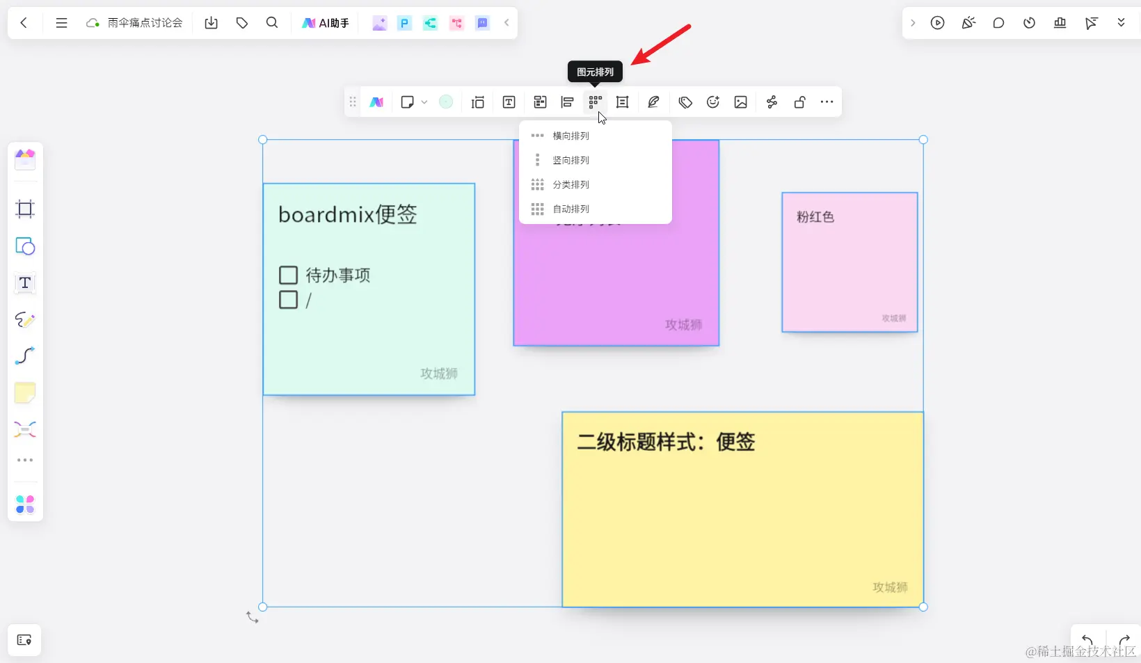 前面说到,boardmix可在白板上添加不限数量的便签,且支持自由移动便签的位置,这是boardmix有别于其他桌面便签的一大特点,当然这种自由操作也会带来一丢丢问题:在便签的数量比较多的场景下,自由摆放的便签会看起来比较凌乱。