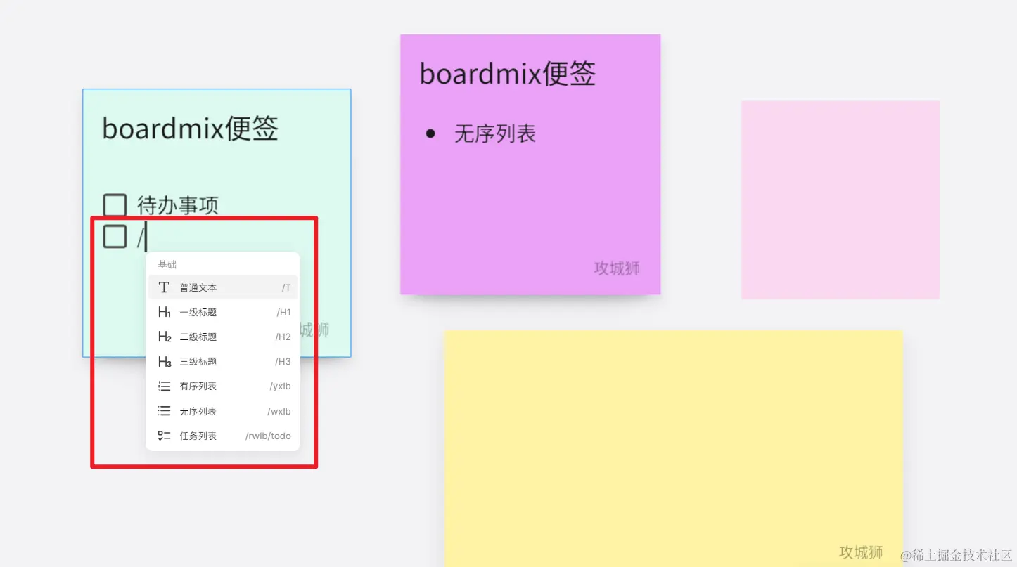 双击boardmix白板上的便签,即可进入编辑状态,可在便签中直接输入内容,如果想要设置文本样式,则在输入内容之前,按下斜杆 / 或者顿号 、 ,呼出下图所示的快捷指令,可快速设置一级标题、二级标题、三级标题、有序列表、无序列表和任务列表样式。