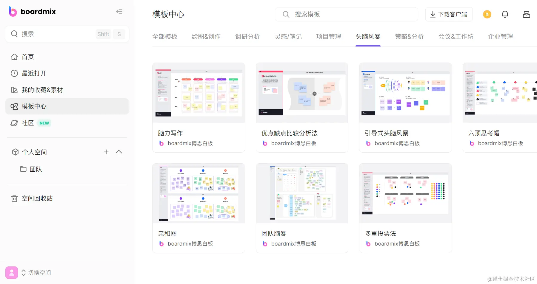 在浏览器打开boardmix博思白板首页,点击下图所示的「协同白板」,新建一个白板文件。