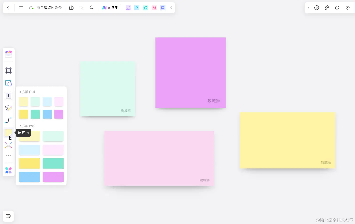 在打开的boardmix白板文件中,点击左侧工具栏的「便签」工具,快捷键为N,在弹出的面板,提供了正方形和长方形两类便签,每一类下面有多种不同的颜色,从中选择一个便签,在白板上单击,即可添加便签。