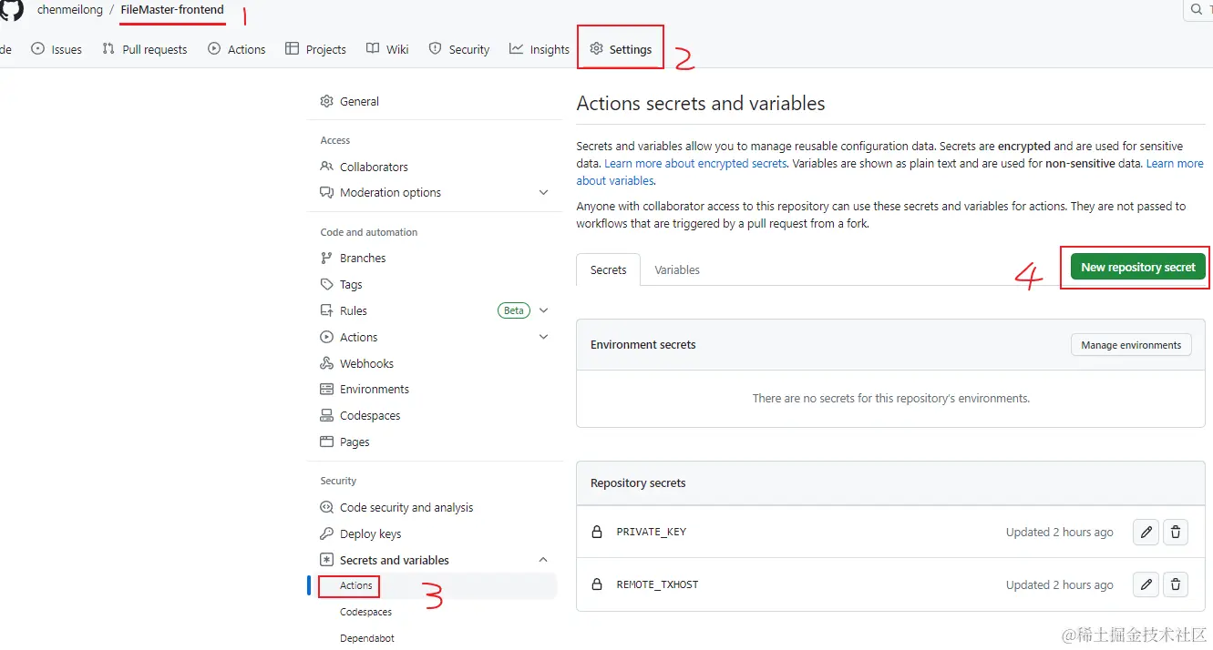 cat ~/.ssh/id_rsa.pub内容,将内容添加到云服务器的~/.ssh/authorized_keys文件中,可以使用vim ~/.ssh/authorized_keys编辑,然后将公钥粘贴进去。 service sshd restart重启SSH服务器。- 查看私钥 cat ~/.ssh/id_rsa 内容,设置到 github secrets 变量 PRIVATE_KEY 中。