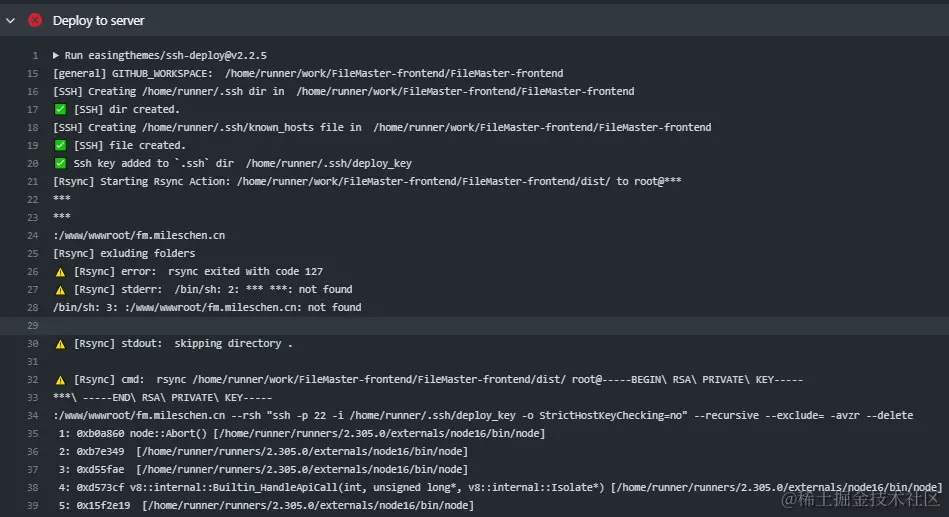 看似是服务器或者git action容器没装rsync。其实不是。出现这种情是IP的问题,上面的IP的填写不要加空行。新建secret时秘钥要加空行,其他参数则不用加。