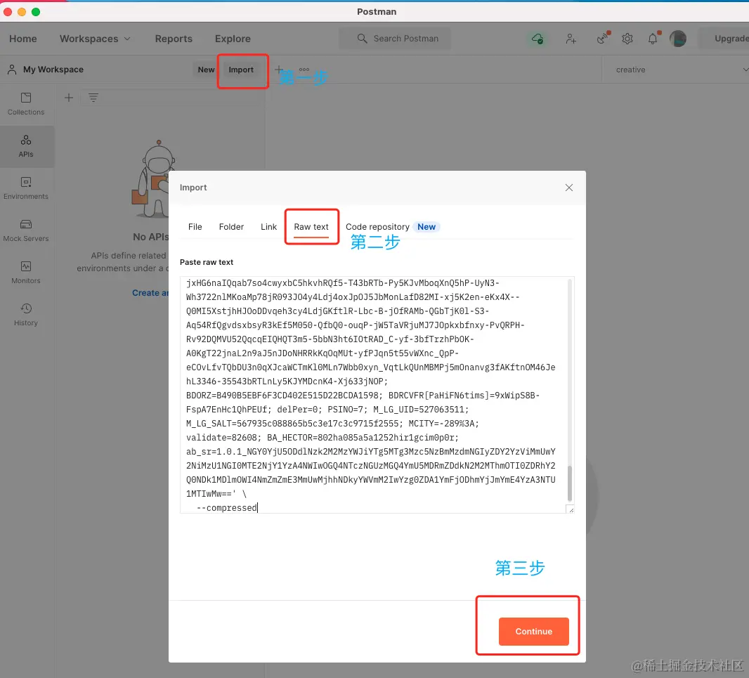 (1). 依次点击 Import->Raw text,粘贴,点击Continue->Import