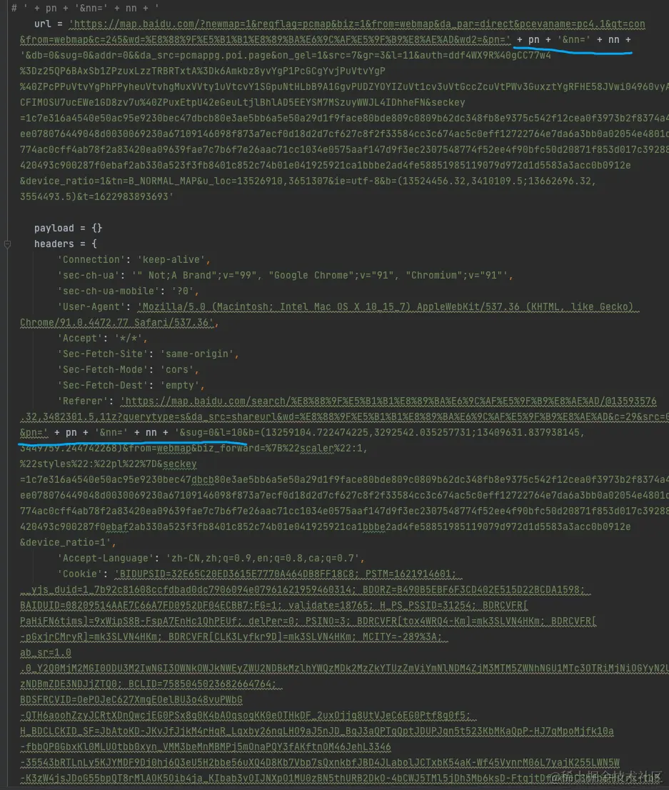 (1). 复制代码到Pycharm, 找到url和headers里面的pn, 将其后面的内容替换为 ' + pn + '&nn=' + nn + '
