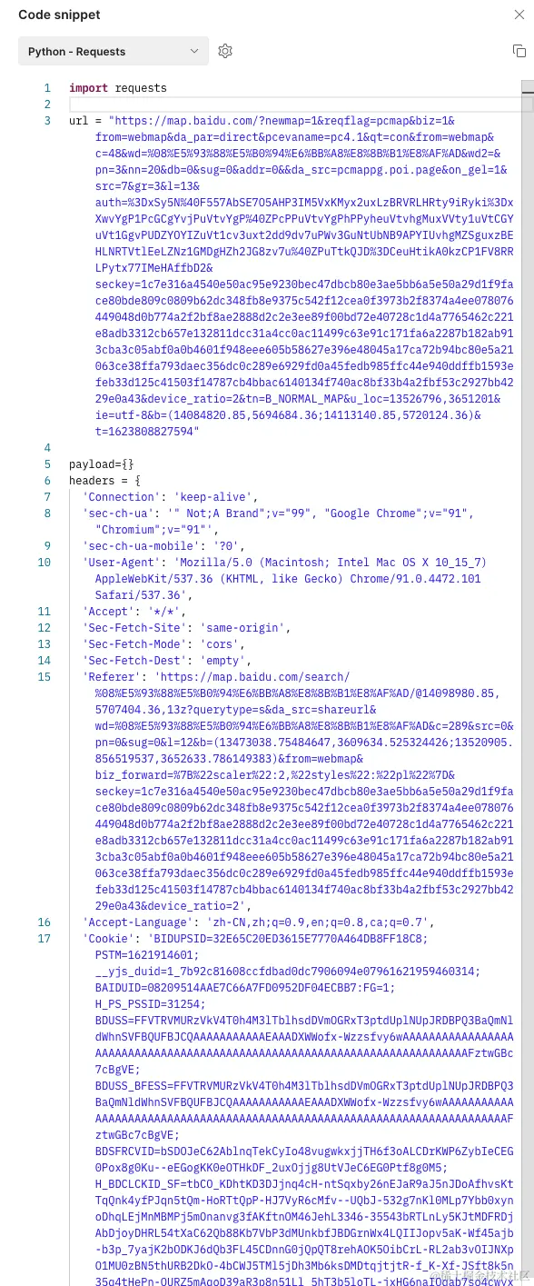 'Cookie': 'BIDUPSID=xxxxxxx; PSTM=1621914601; __yjs_duid=1_7b92c81608ccfdbad0dc7906094e07961621959460314; BDORZ=B490B5EBF6F3CD402E515D22BCDA1598; BAIDUID=08209514AAE7C66A7FD0952DF04ECBB7:FG=1; validate=18765; H_PS_PSSID=31254; BDRCVFR[PaHiFN6tims]=9xWipS8B-FspA7EnHc1QhPEUf; delPer=0; PSINO=3; BDRCVFR[tox4WRQ4-Km]=mk3SLVN4HKm; BDRCVFR[-pGxjrCMryR]=mk3SLVN4HKm; BDRCVFR[CLK3Lyfkr9D]=mk3SLVN4HKm; MCITY=-289%3A; ab_sr=1.0.0_Y2Q0MjM2MGI0ODU3M2IwNGI3OWNkOWJkNWEyZWU2NDBkMzlhYWQzMDk2MzZkYTUzZmViYmNlNDM4ZjM3MTM5ZWNhNGU1MTc3OTRiMjNiOGYyN2UzNDBmZDE3NDJjZTQ0; BCLID=7585045023682664764; BDSFRCVID=OePOJeC627XmgEOelBU3o48vuPWbG-QTH6aoohZzyJCRtXDnQwcjEG0PSx8g0K4bAOqsogKK0eOTHkDF_2uxOjjg8UtVJeC6EG0Ptf8g0f5; H_BDCLCKID_SF=JbAtoKD-JKvJfJjkM4rHqR_Lqxby26nqLHO9aJ5nJD_BqJ3aQPTqQptJDUPJqn5t523KbMKaQpP-HJ7qMpoMjfk10a-fbbQP0GbxKl0MLUOtbb0xyn_VMM3beMnMBMPj5mOnaPQY3fAKftnOM46JehL3346-35543bRTLnLy5KJYMDF9Dj0hj6Q3eU5H2bbe56uXQ4D8Kb7Vbp7sQxnkbfJBD4JLabolJCTxbK54aK-Wf45VynrM06L7yajK255LWN5W-K3zW4jsJDoG55bpQT8rMlAOK5Oib4ja_KIbab3vOIJNXpO1MU0zBN5thURB2DkO-4bCWJ5TMl5jDh3Mb6ksD-FtqjtDfnkDoC8hfb6HHTrz-tb5-ICShUFshjbTB2Q-5KL-ytbv8-jkbfJWWfFeja7q-lQ7tJ603fbdJJjoOqcuXPr1ett_babhaPvmQgTxoUJvBCnJhhvG-4clb60ebPRiJPQ9QgbWKpQ7tt5W8ncFbT7l5hKpbt-q0x-jLTnhVn0M5DK0hID9jTLaDToMhfQ2etrKK572sJOOaCvbjbvOy4oTj6j-3-c9el3-JnRiLbA2fPQhSDbRjpJG3MvB-fnjb4DDX57MafjaLJ7sffDlQft205kbeMtjBbQaaGTh_n7jWhk2eq72y-RUQlRX5q79atTMfNTJ-qcH0KQpsIJM5-DWbT8EjHCeJT_OJbkJVCvMaP55K43xKITjh6PgbJ39BtQmJJufhn6j3l7qDhoaDPPMebK00bJa0KrIQg-q3R7O2Uc0JqcJ0ROiQ-Cu5UbB0x-jLN7OVn0MWKbDEq7lKPnJyUnQbtnnBPnR3H8HL4nv2JcJbM5m3x6qLTKkQN3T-PKO5bRh_CcJ-J8XMC_xjj3P; BCLID_BFESS=7585045023682664764; BDSFRCVID_BFESS=OePOJeC627XmgEOelBU3o48vuPWbG-QTH6aoohZzyJCRtXDnQwcjEG0PSx8g0K4bAOqsogKK0eOTHkDF_2uxOjjg8UtVJeC6EG0Ptf8g0f5; H_BDCLCKID_SF_BFESS=JbAtoKD-JKvJfJjkM4rHqR_Lqxby26nqLHO9aJ5nJD_BqJ3aQPTqQptJDUPJqn5t523KbMKaQpP-HJ7qMpoMjfk10a-fbbQP0GbxKl0MLUOtbb0xyn_VMM3beMnMBMPj5mOnaPQY3fAKftnOM46JehL3346-35543bRTLnLy5KJYMDF9Dj0hj6Q3eU5H2bbe56uXQ4D8Kb7Vbp7sQxnkbfJBD4JLabolJCTxbK54aK-Wf45VynrM06L7yajK255LWN5W-K3zW4jsJDoG55bpQT8rMlAOK5Oib4ja_KIbab3vOIJNXpO1MU0zBN5thURB2DkO-4bCWJ5TMl5jDh3Mb6ksD-FtqjtDfnkDoC8hfb6HHTrz-tb5-ICShUFshjbTB2Q-5KL-ytbv8-jkbfJWWfFeja7q-lQ7tJ603fbdJJjoOqcuXPr1ett_babhaPvmQgTxoUJvBCnJhhvG-4clb60ebPRiJPQ9QgbWKpQ7tt5W8ncFbT7l5hKpbt-q0x-jLTnhVn0M5DK0hID9jTLaDToMhfQ2etrKK572sJOOaCvbjbvOy4oTj6j-3-c9el3-JnRiLbA2fPQhSDbRjpJG3MvB-fnjb4DDX57MafjaLJ7sffDlQft205kbeMtjBbQaaGTh_n7jWhk2eq72y-RUQlRX5q79atTMfNTJ-qcH0KQpsIJM5-DWbT8EjHCeJT_OJbkJVCvMaP55K43xKITjh6PgbJ39BtQmJJufhn6j3l7qDhoaDPPMebK00bJa0KrIQg-q3R7O2Uc0JqcJ0ROiQ-Cu5UbB0x-jLN7OVn0MWKbDEq7lKPnJyUnQbtnnBPnR3H8HL4nv2JcJbM5m3x6qLTKkQN3T-PKO5bRh_CcJ-J8XMC_xjj3P; BA_HECTOR=8k240g80012g85akjb1gbpdtl0q; BAIDUID_BFESS=EE9C87CC527526D94BAF4BBF7C68C795:FG=1; BAIDUID=119C90F3DD22536C575B00C437176785:FG=1; MCITY=-289%3A'
