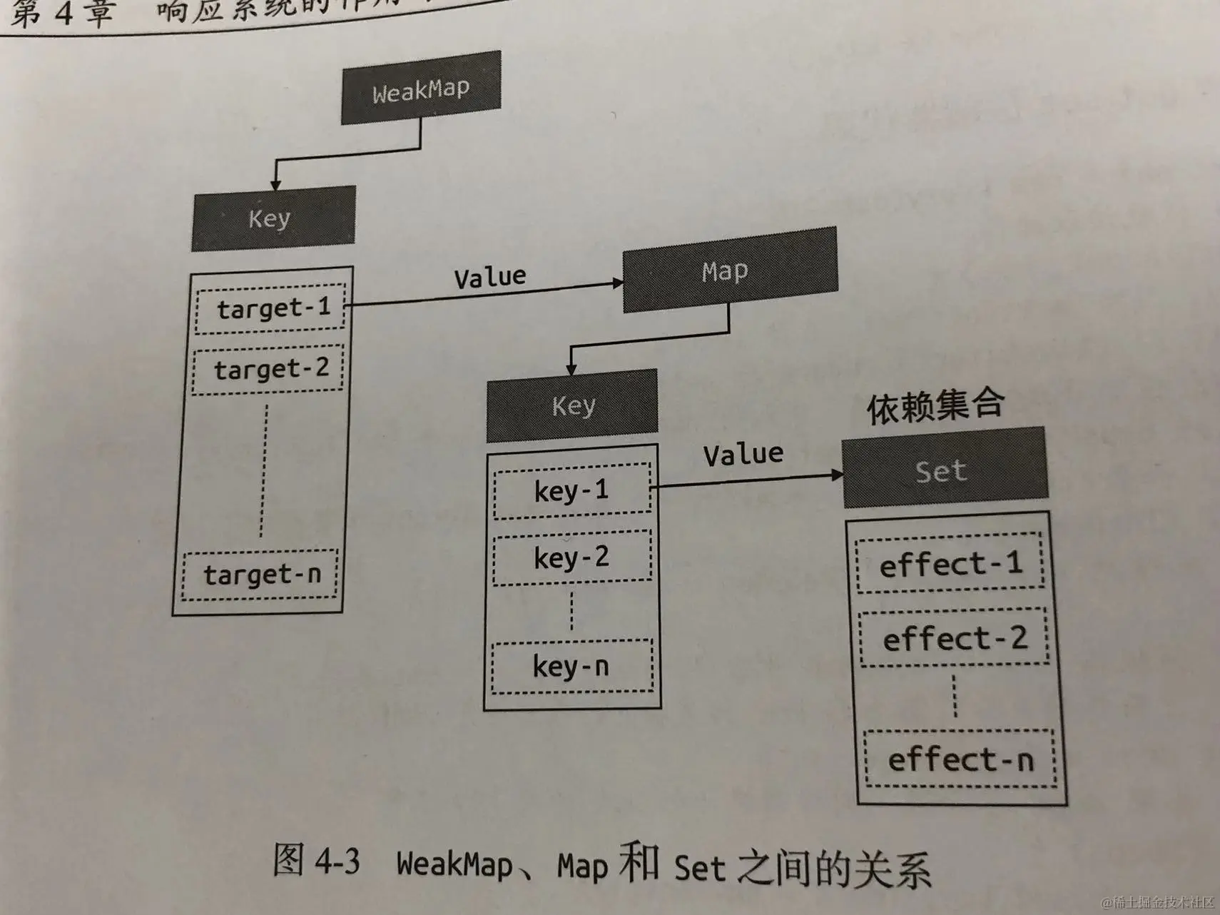 let deps = depsMap.get(key) // 再根据key从depsMap中取出deps 它是一个Set类型 里面存储着所有与当前key相关的副作用函数:effects