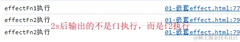 let temp1, temp2 effect(function effectFn1() { // f1嵌套了f2 console.log('effectFn1执行'); effect(function effectFn2() { console.log('effectFn2执行'); temp2 = obj.bar }) temp1 = obj.foo }) setTimeout(() => { obj.foo = false; }, 2000)