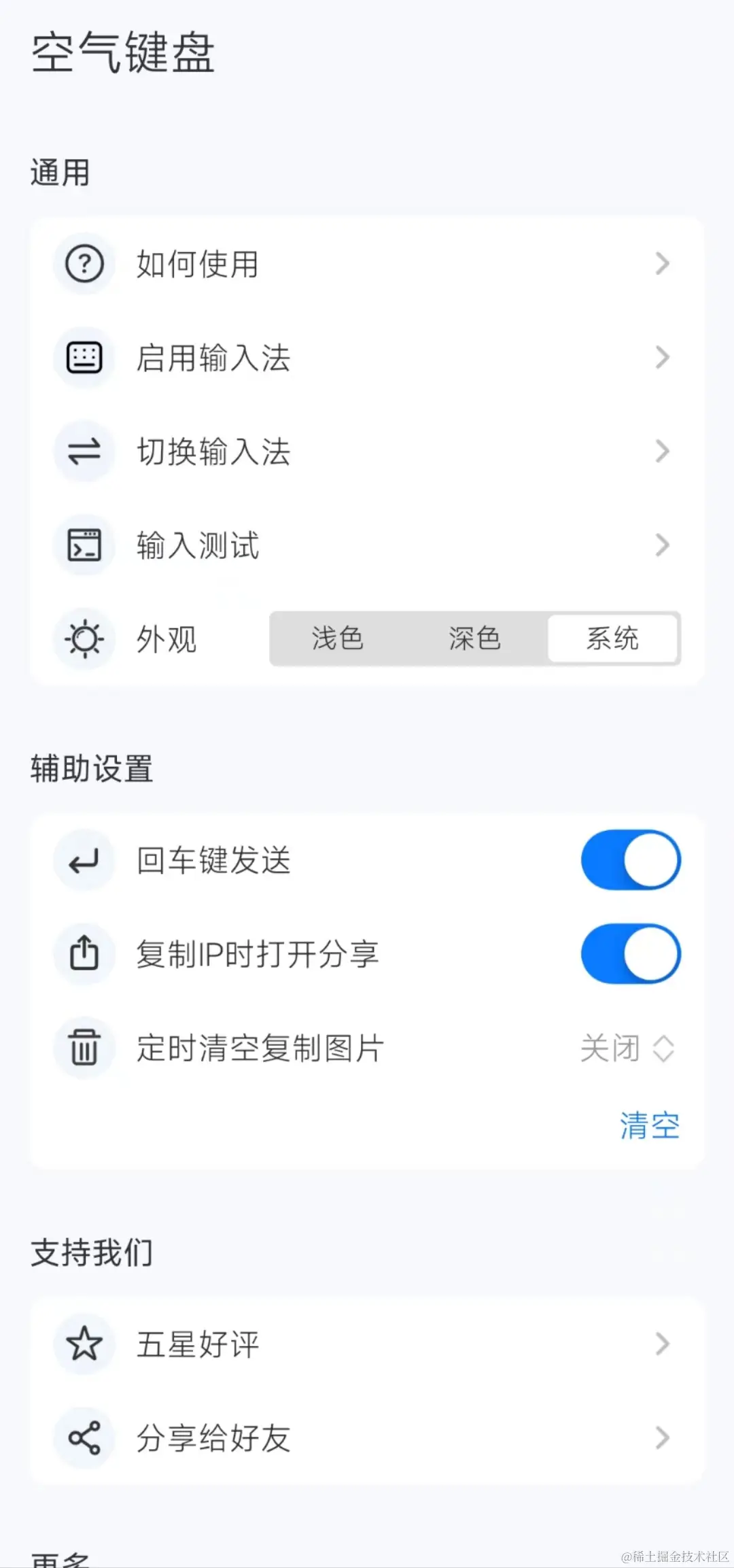 它的设置界面同样简洁明了,提供了如外观切换、回车键发送和定时清理图片等功能。