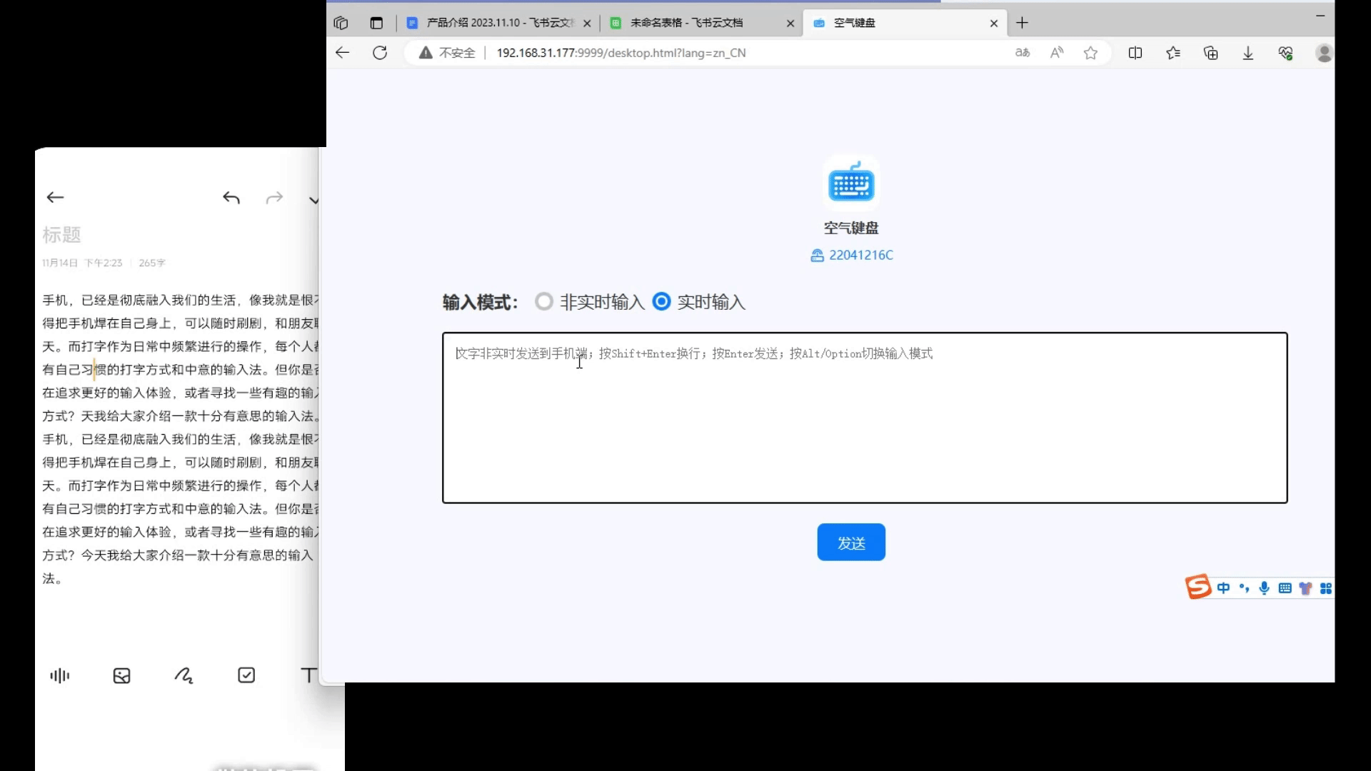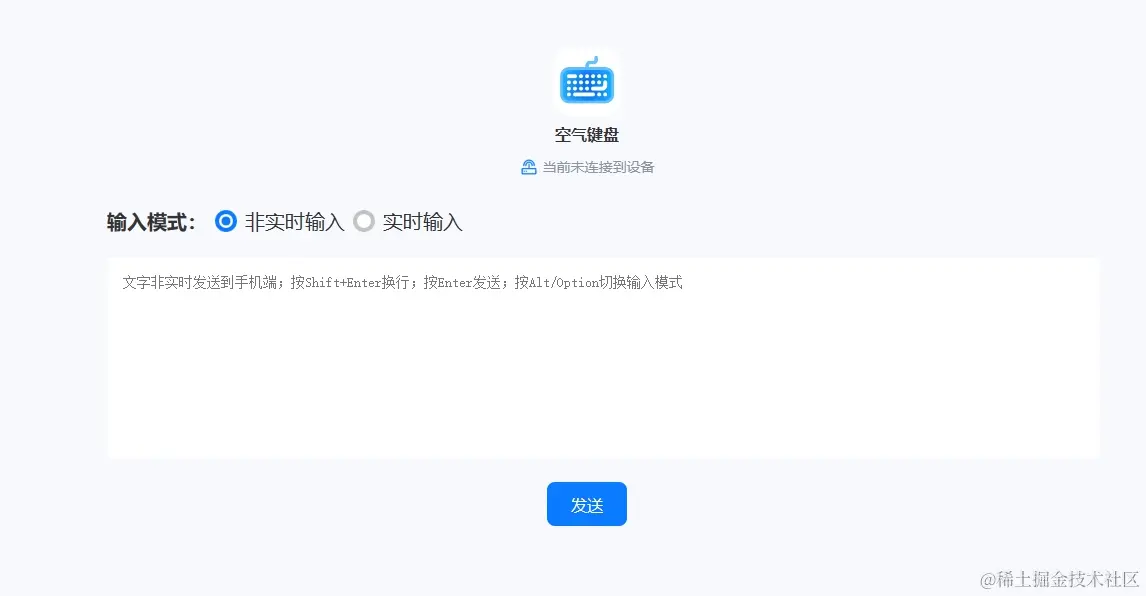 - 非实时模式:可以在网页的文本框当中输入并编辑大段的文字,编辑完成后再发送到手机上,这个模式适用于大多数的场合
