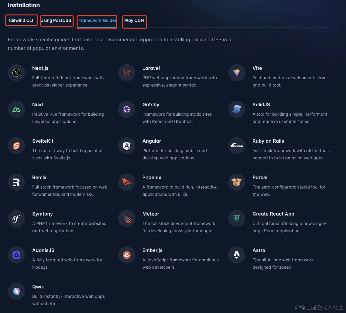 在Tailwind CSS 官网中,为我们提供了,四种方式来使用Tailwind CSS。