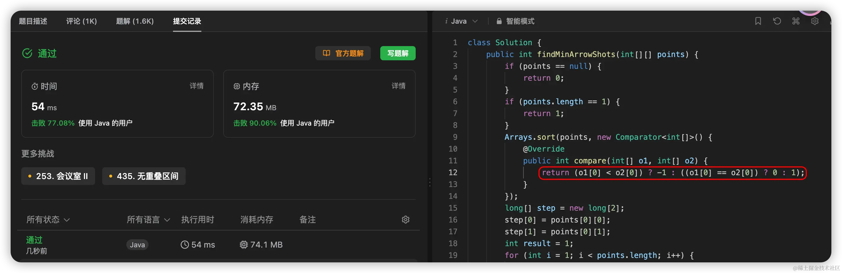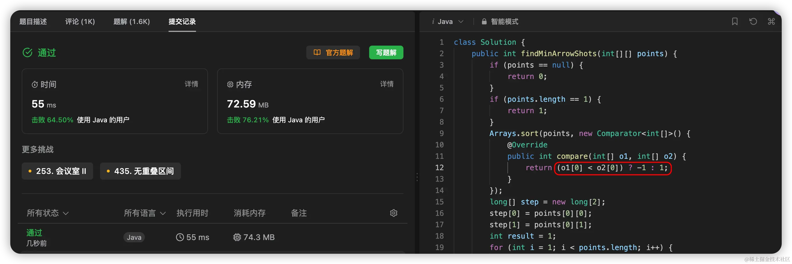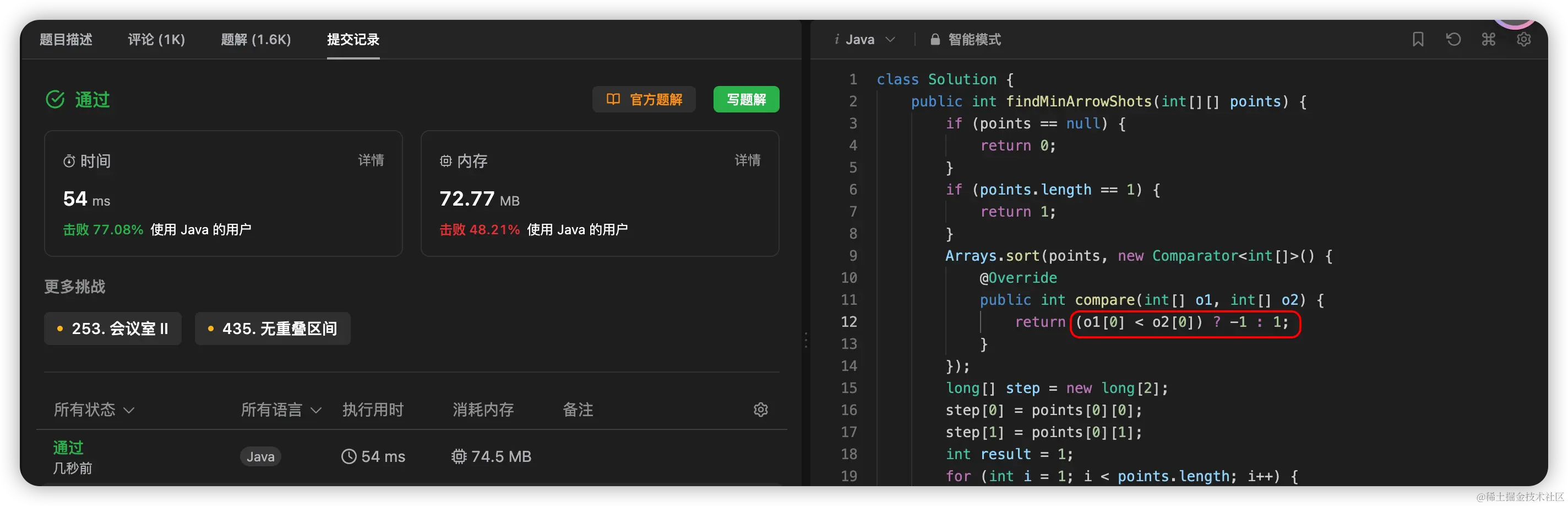 可以看到官方版在执行的时间复杂度、空间复杂度都表现的更好,并且在自定义比较器时,采用Integer.compare(a[0], b[0])),即Integer内置比较方法,不会溢出,案例中有一个int[][] points = {{-2147483646, -2147483645}, {2147483646, 2147483647}};(我就是卡在了这个案例,本地Debug才发现这个例子中-2147483646和2147483646做差会导致超出Integer的范围(Integer的取值范围是从-2147483648 至 2147483647(-2^31至2^31-1))导致排序出错),也可以用我那版中的方法:o1[0] > o2[0] ? 1 : -1;,反正就是避免元素出界。