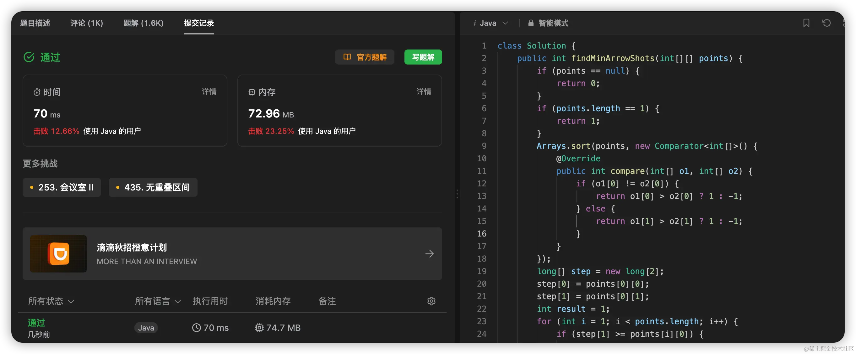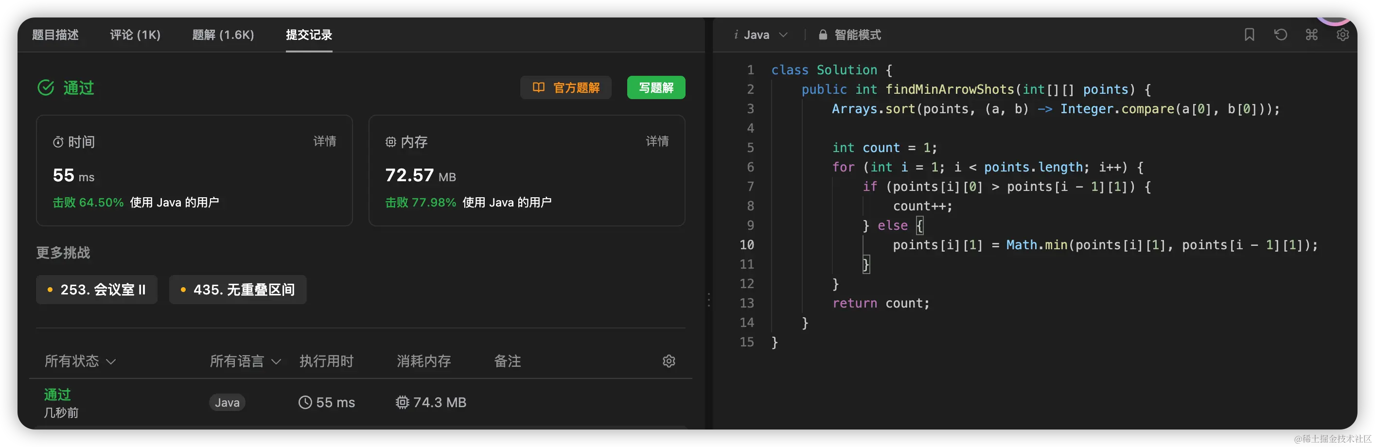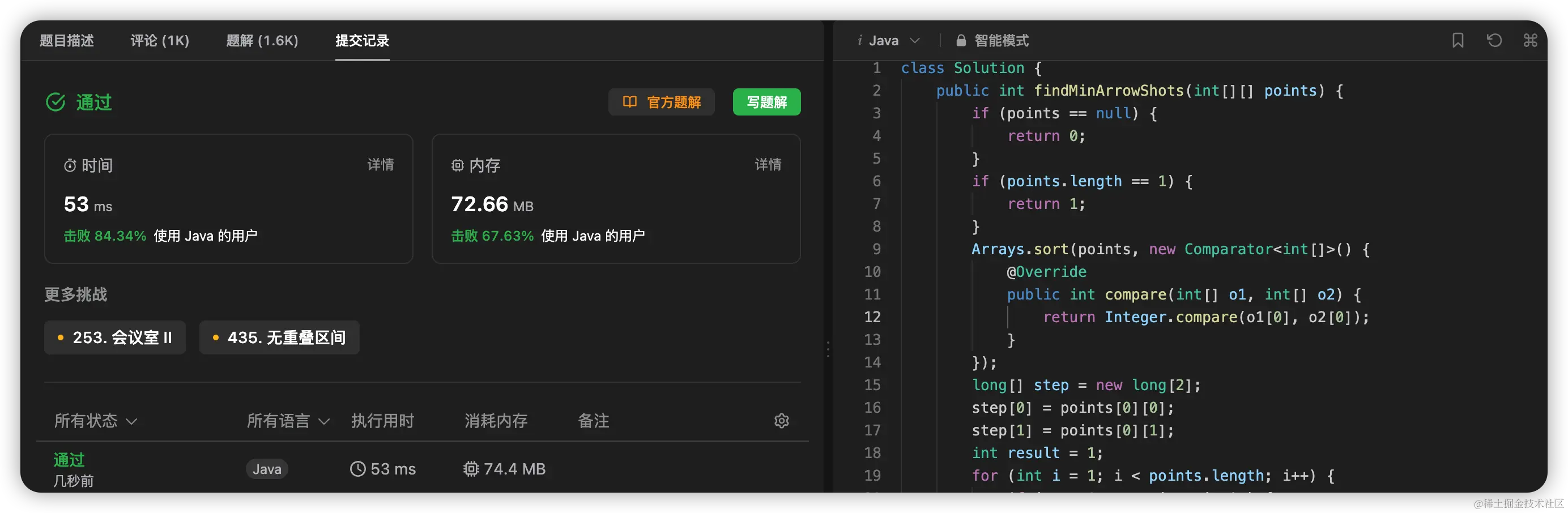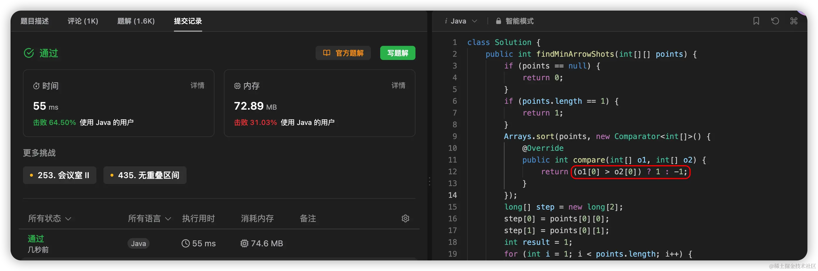可以看到官方版在执行的时间复杂度、空间复杂度都表现的更好,并且在自定义比较器时,采用Integer.compare(a[0], b[0])),即Integer内置比较方法,不会溢出,案例中有一个int[][] points = {{-2147483646, -2147483645}, {2147483646, 2147483647}};(我就是卡在了这个案例,本地Debug才发现这个例子中-2147483646和2147483646做差会导致超出Integer的范围(Integer的取值范围是从-2147483648 至 2147483647(-2^31至2^31-1))导致排序出错),也可以用我那版中的方法:o1[0] > o2[0] ? 1 : -1;,反正就是避免元素出界。