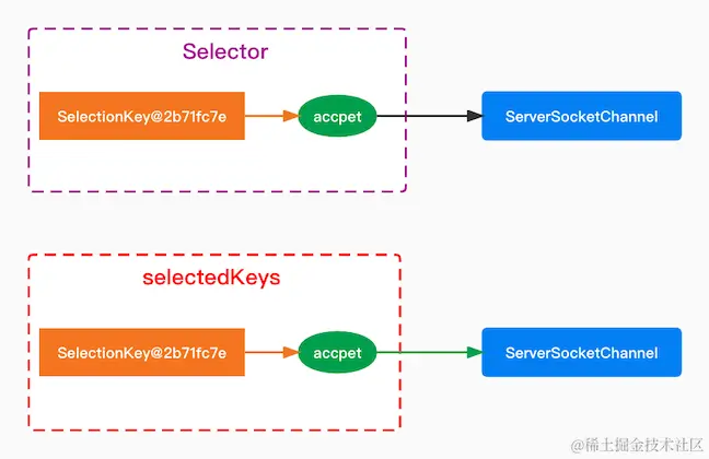 selector.selectedKeys()会返回 Set 集合,该集合包含了已经准备就绪的 SelectionKey,这个时候只有连接事件,相对应的 SelectionKey 为 2b71fc7e