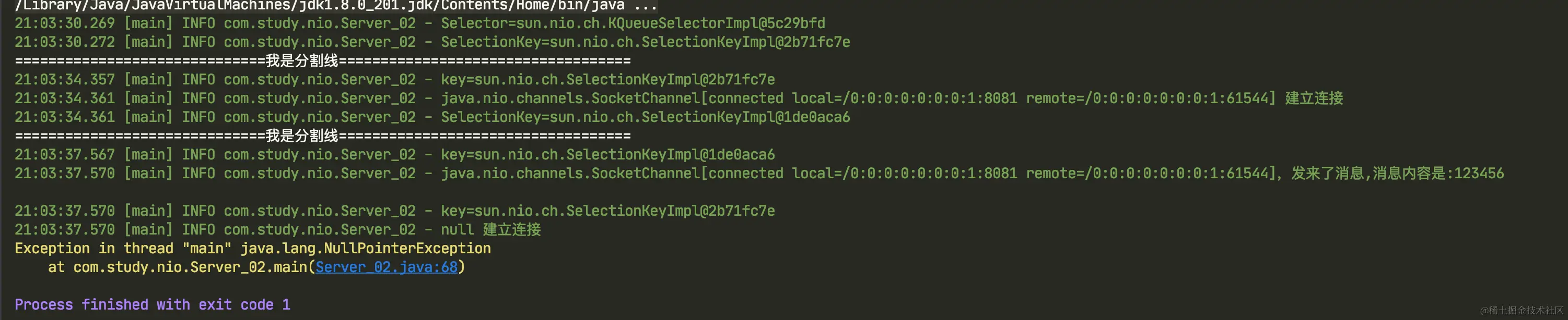 在迭代过程第一次取的是 SelectionKey@1de0aca6,这个是读事件,可以正常读,打印客户端发送过来的,但是第二次读取的是 SelectionKey@2b71fc7e,但是这个 Key 与之相绑定的事件已经处理了,它为 null,那肯定会报 NullPointerException。所以在使用 NIO 时一定要主动删除已经处理过的 SelectionKey ,既主动调用 key.remove(),删除该 SelectionKey。