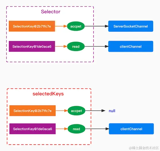 - 当服务端与客户端建立连接后,绑定 Selector 并关注 read 事件。这里需要注意的是 Selector 并不会主动去删除 SelectionKey,它只会增加,所以这个时候 Selector 里面有两个 SelectionKey,一个是 2b71fc7e(accept),一个是 1de0aca6(read)。建立连接后,事件处理完成,会该事件与之对应的事件去掉,也就是 2b71fc7e 的 SelectionKey 绑定的 ServerSocketChannel ,但是 Selector 里面对应的 SelectionKey 还是存在的。