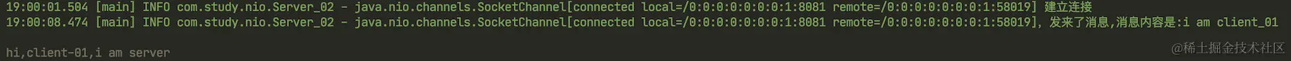 建立连接后,客户端发送消息i am client_01,服务端收到消息,然后给客户端发送消息hi,client-01,i am server。