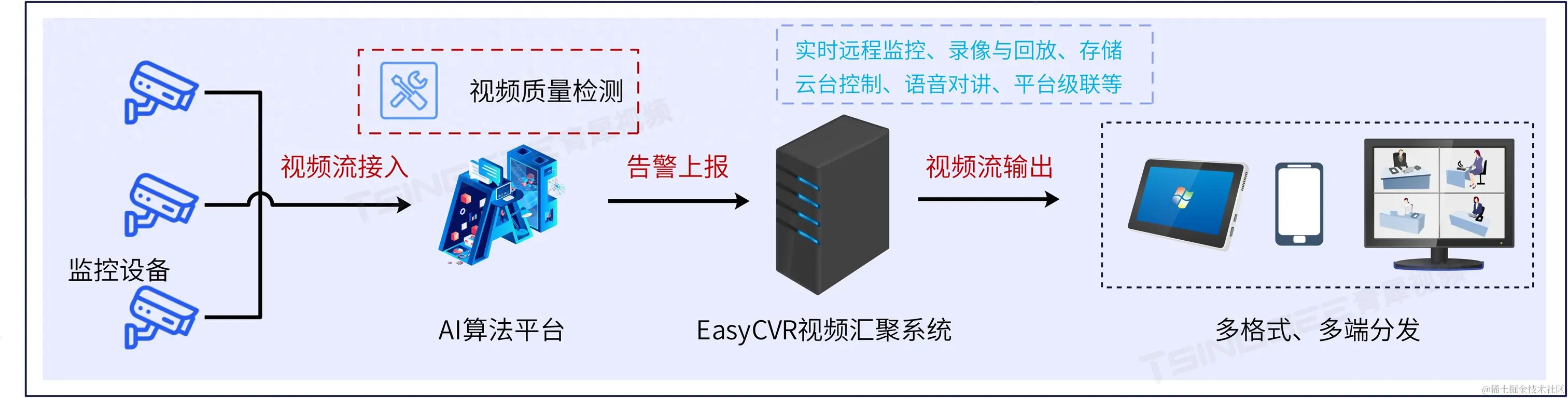 EasyCVR视频汇聚管理系统基于云边端架构,具有强大的数据接入、处理及分发能力,平台能在复杂的网络环境中,将分散的各类视频资源进行统一汇聚、整合、集中管理,实现视频资源的鉴权管理、按需调阅、转码与处理、全网分发、告警上报、视频集中存储、智能分析等。