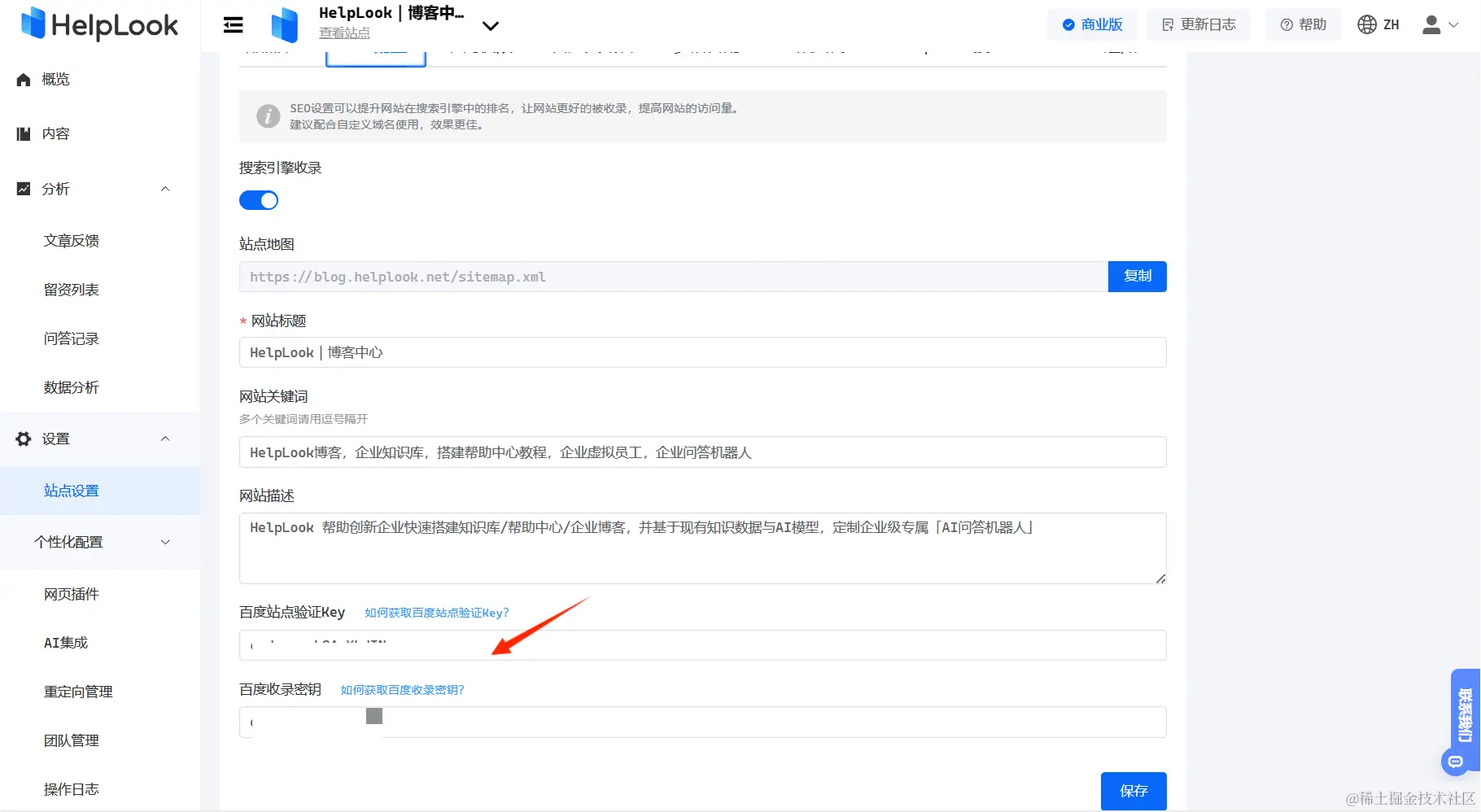 HelpLook和Baklib都支持SEO配置,但是HelpLook的优势点在于完善好SEO后,会自动提交百度收录。我们都知道文章被收录的话,就可以增加产品的曝光度,提升网站在搜索引擎中的排名,提高网站的访问量。你可以将获取的百度密钥添加到HelpLook后台的SEO配置中,添加之后,你在站点发表的每一篇文章都会自动帮你提交百度收录,SEO效果很赞。