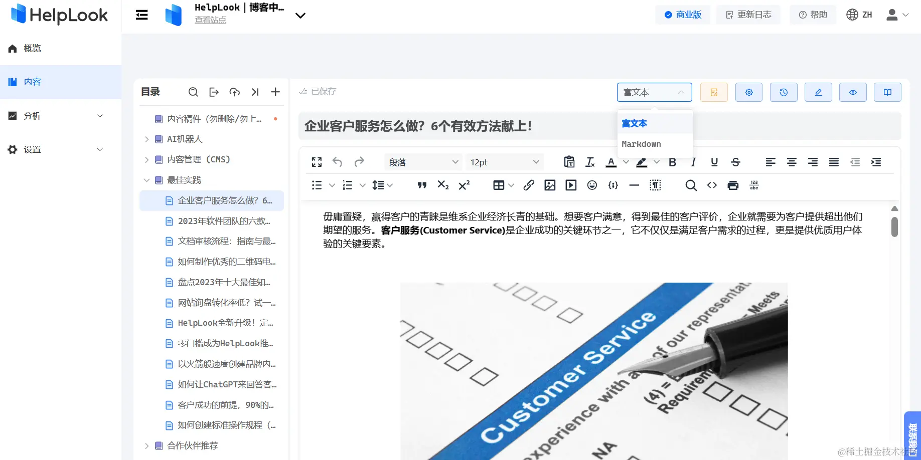 在文档编辑这一块HelpLook可以说是比较优秀的。首先,HelpLook支持富文本和Markdown编辑,而Baklib是不支持富文本编辑的。运营过内容的都知道,编辑内容的时候最不喜欢跳来跳去点预览来看看文章的最终呈现效果,而富文本编辑器就可以很好地解决这个通病,因为它是所见即所得的。使用富文本编辑器来编辑文章内容意味着你在编辑文章的同时就可以看到文章最终呈现效果,而不用点击预览跳转到另外的页面查看,省时省力。