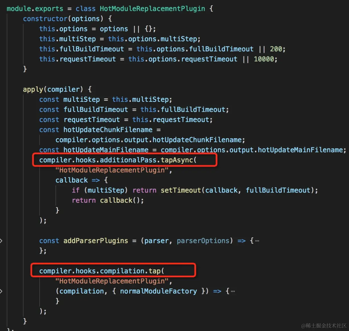 举个例子,下面是我们经常使用的热更新插件代码,它订阅了 additionalPass 等 hook。