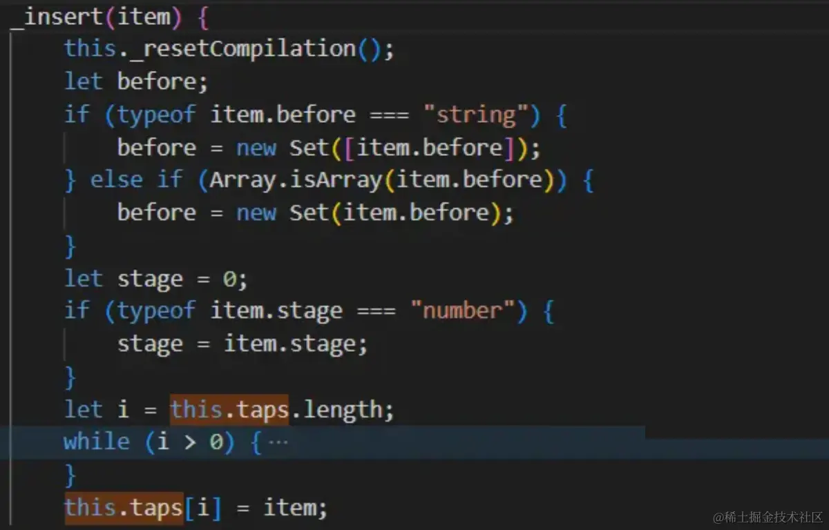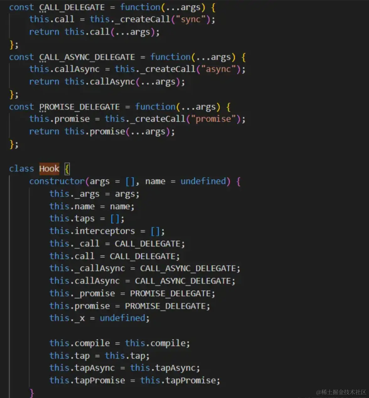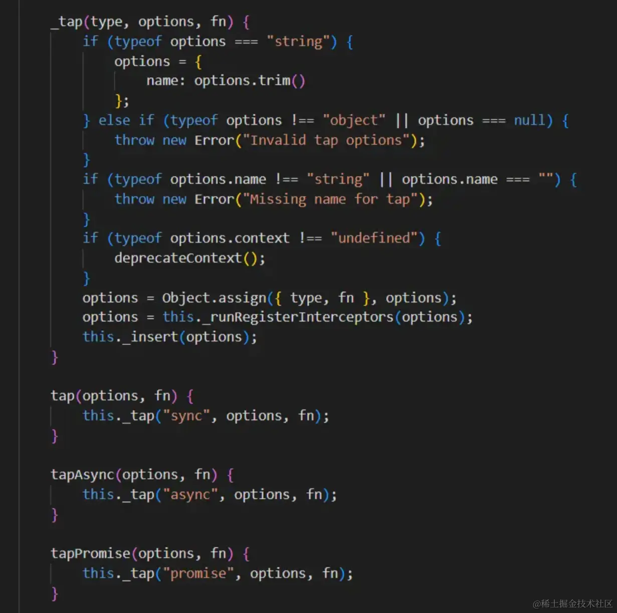 可见,tapable 采用的是发布订阅方式,通过 tap 函数注册监听函数,然后通过 call 函数按顺序执行之前注册的函数。