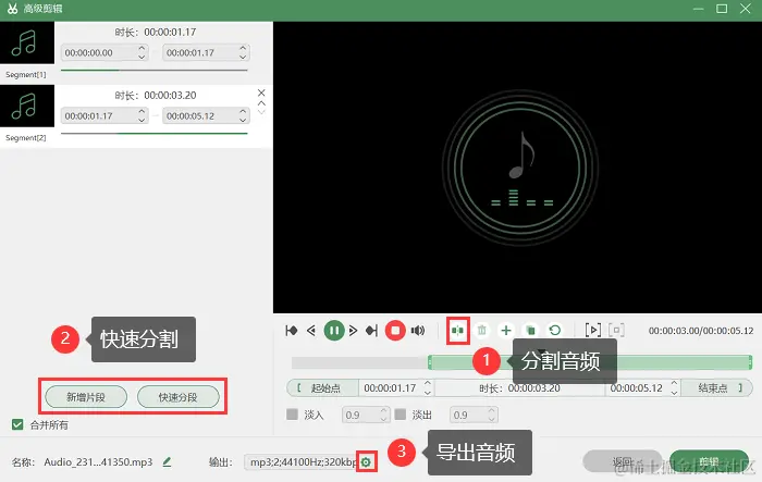 第4步:在录制音频的过程中,您可以在控制栏随时停止或关闭录音。录音结束后,您可以选择直接保存,或者进入音频剪辑页面进行更多操作。
