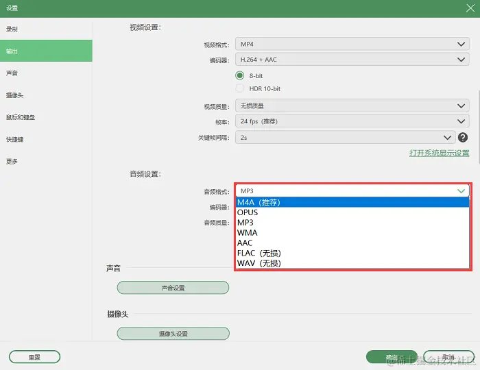 第3步:如果您对音频格式有更多的需求,右上角可以进入到音频输出页面,在这里可以进行音频格式设置,设置完成后返回录制页面,点击开始录音。