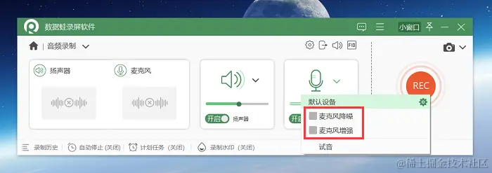 第2步:在音频录制模式中,可以看见有扬声器与麦克风两个选项,点击麦克风设备旁边的小倒三角,可以勾选麦克风增强与麦克风降噪。
