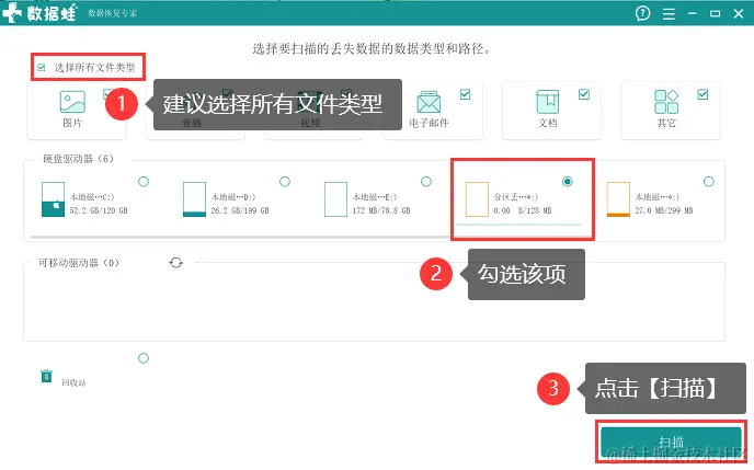 步骤2:选择需要扫描的文件类型(如果分区后丢失的数据类型比较多,建议选择所有文件类型),并在硬盘驱动器处选择【分区丢失】 ,然后点击【扫描】 ;