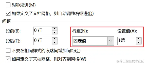 2.进入【段落】对话框,将行距设置为【固定值】【1磅】,点击【确定】 。