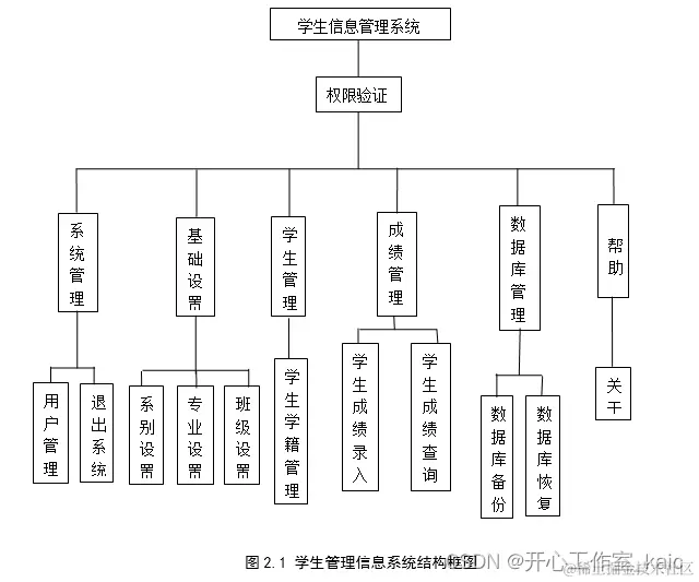 模块的功能设计,本学生信息管理信息系统主要可以分为:权限验证模块、用户管理模块、基础设置模块、成绩管理模块、学生管理模块、数据库管理模块以及帮助模块,如图2.1所示。