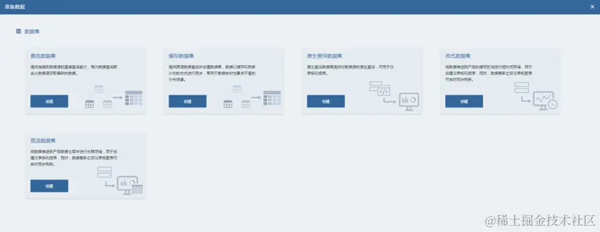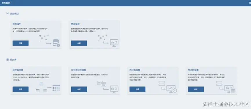 数据的准备过程是对分散、异构的数据进行一定的整合加工,从而形成可以用于数据分析和展示的数据集或模型。对于仪表板和报表的不同场景,Wyn 中有直连模型、抽取模型、直连数据集、缓存数据集、原生查询数据集、流式数据集以及推送数据集等多种类型。