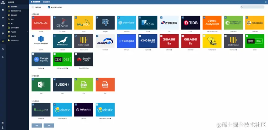 Wyn 支持当前市面上几乎所有的数据管理产品,包括关系型数据库Oracle、Mysql、SqlServer,非关系型数据库MongoDB、Redis,文件型数据库Excel、JSON等等。即使是没有内置到系统中的数据库,也可以通过ODATA的方式接入使用。