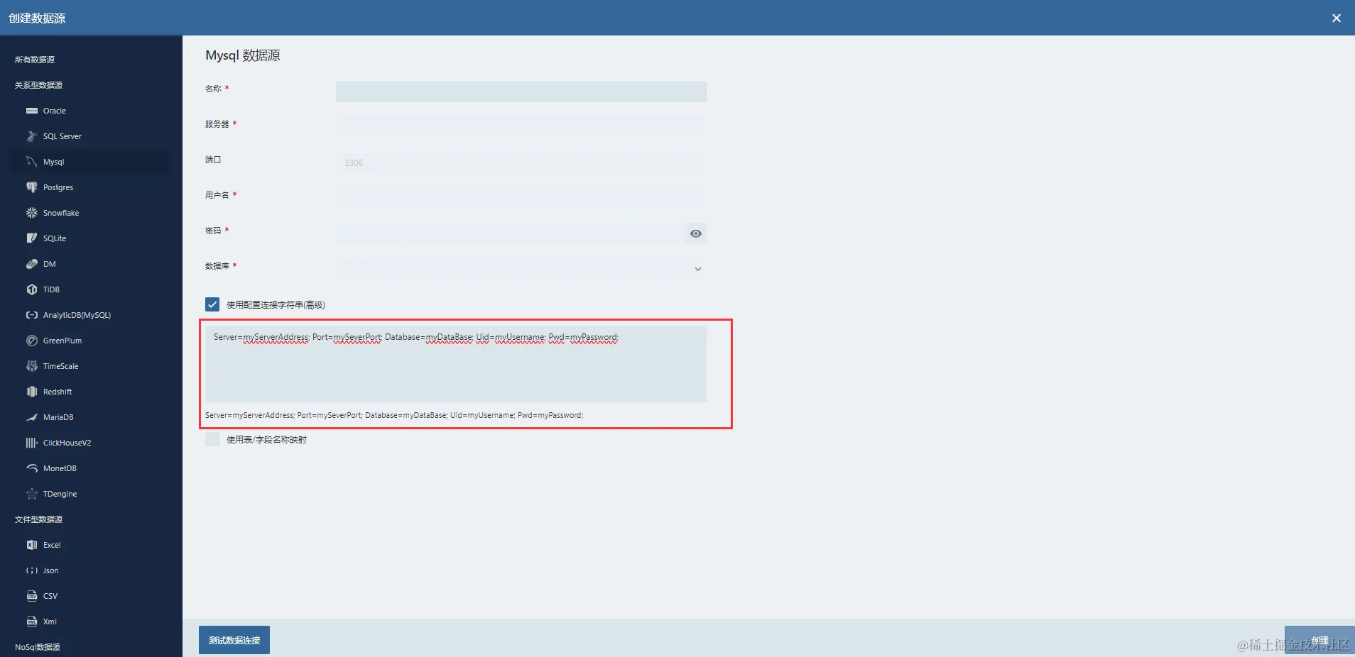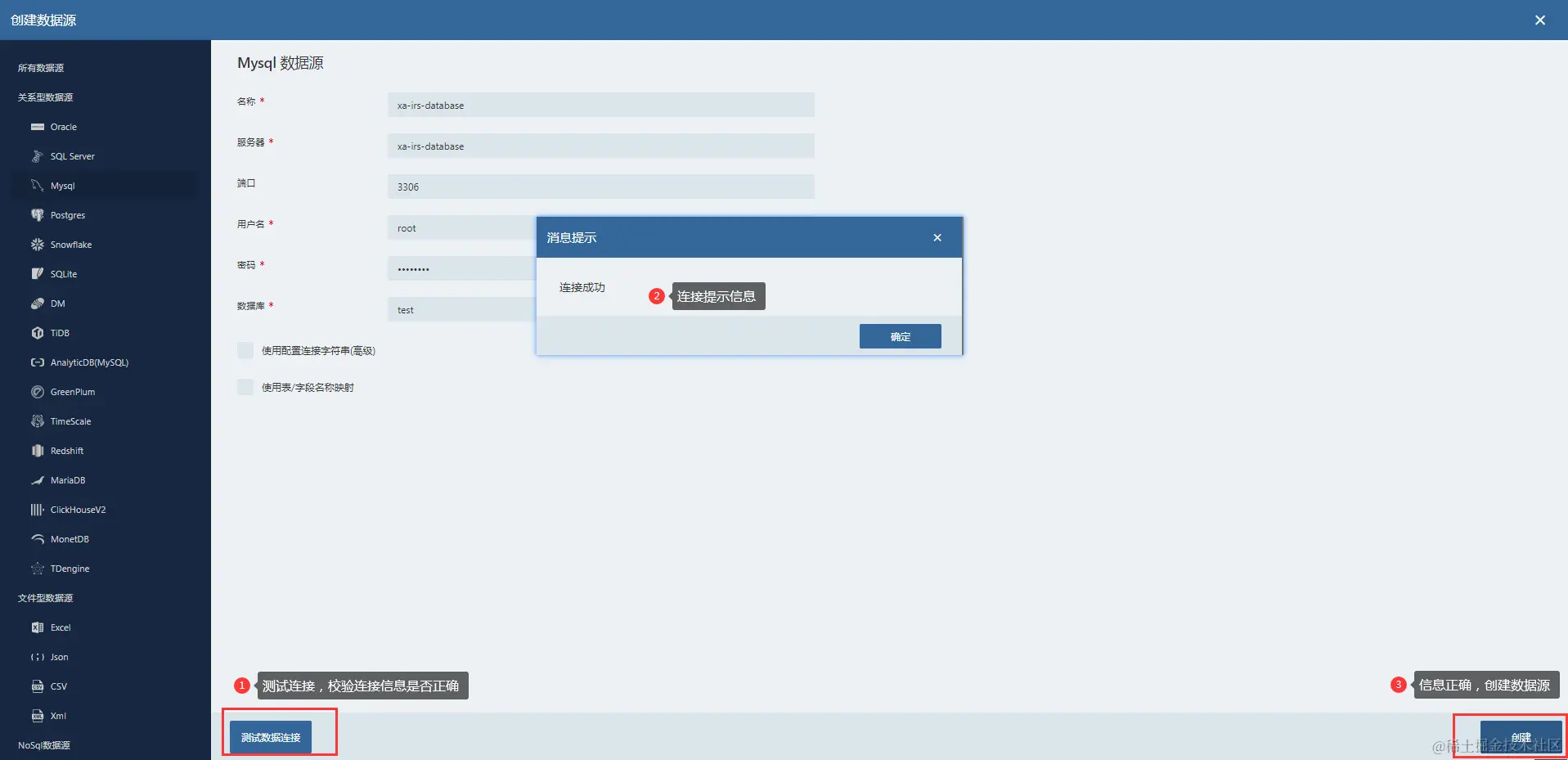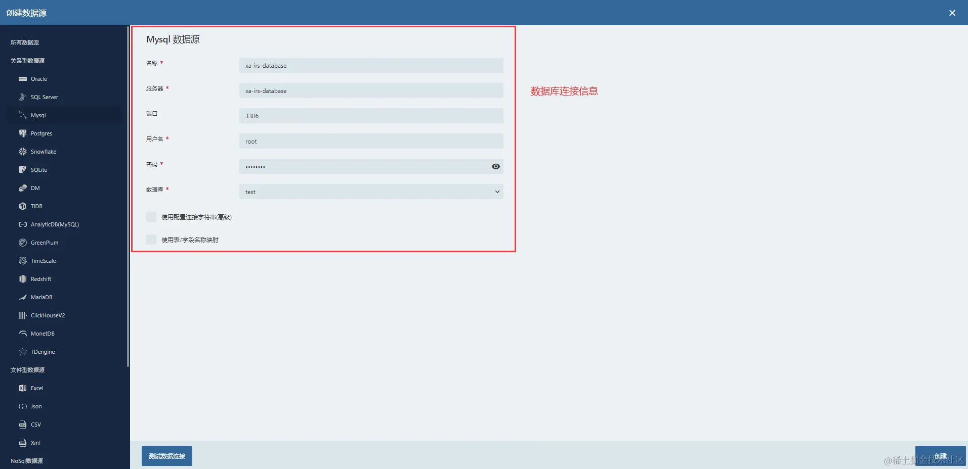 信息录入完毕之后,可以通过左下角的"测试数据连接"来校验信息是否正确,是否可以正确连接到数据源