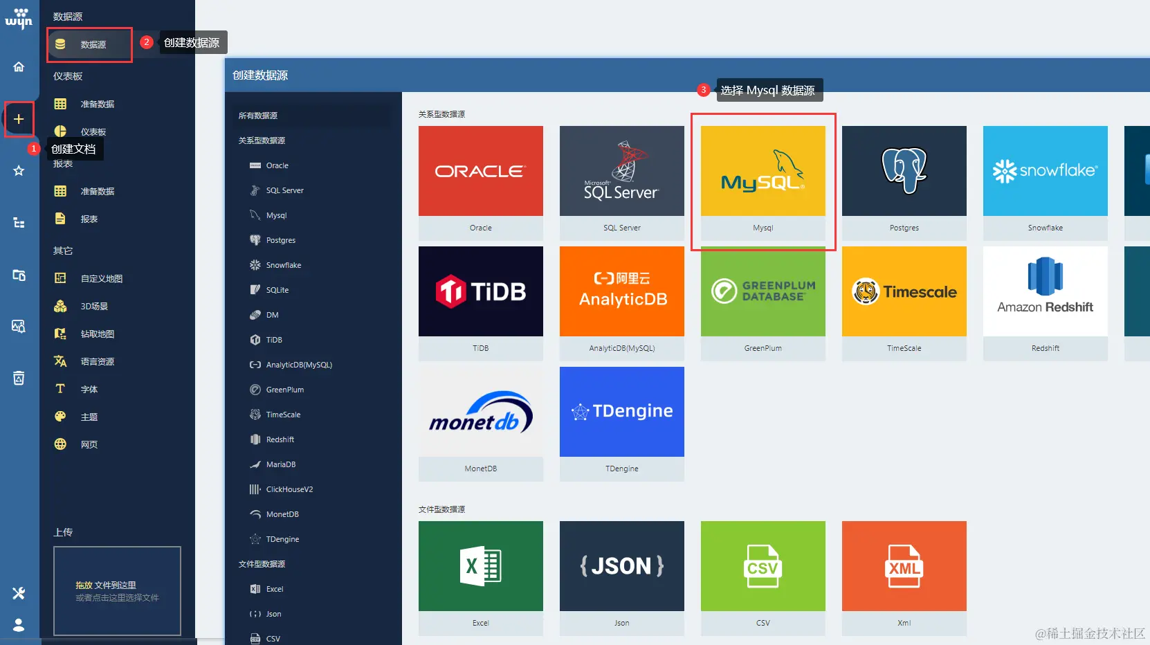 在 Wyn 中通过"创建文档-->数据源",就进入了数据源创建页面,在页面中找到 Mysql 数据库: