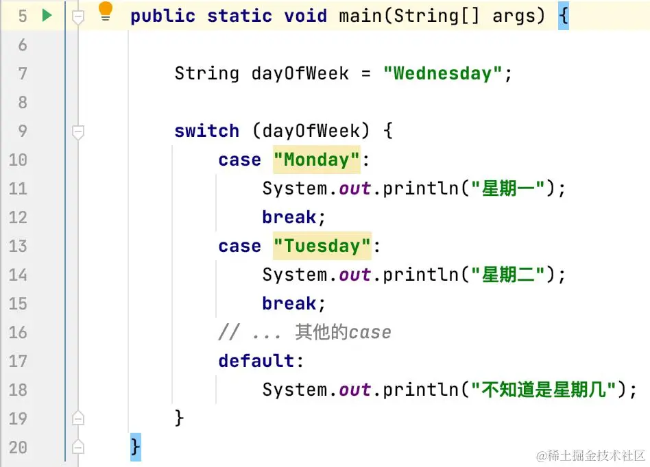 在上面的例子中,我们使用了整数类型的dayOfWeek变量,Switch语句根据这个变量的值来执行相应的代码块。这是传统的Switch用法,非常简单直观。