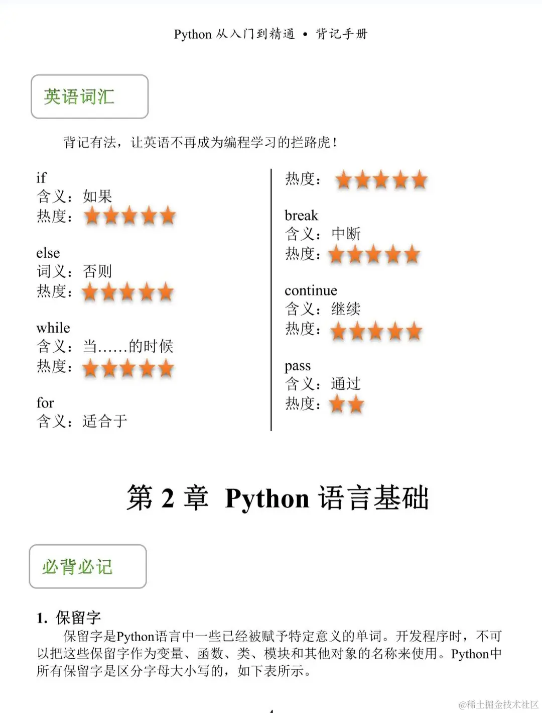 Python是一门现在常用的编程语言,很多刚开始学习的小白有时候摸不准刚开始的学习内容有哪些,又应该从哪里开始学,所以整理了一份适合新手小白学习的背记手册,里面包括一些必背必会的知识点,如下: