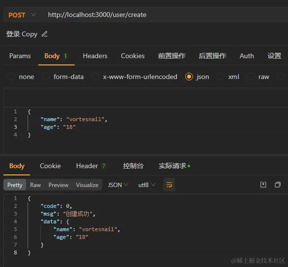 请求正常响应,且返回正确,那么一个简单的创建接口就完成了。