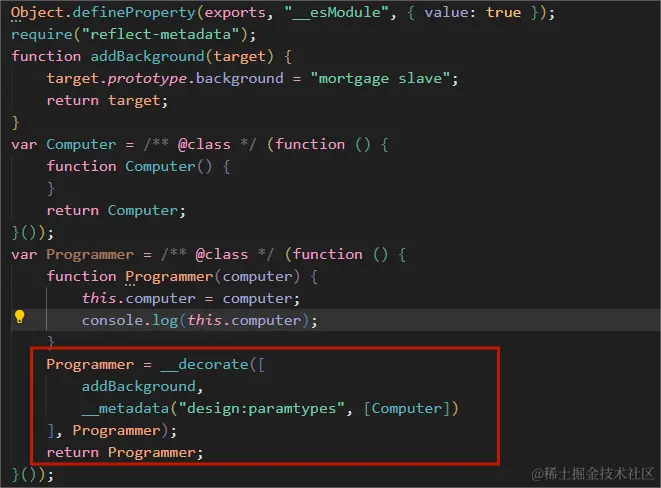 上面这段代码,在 tsconfig.json 把编译选项 emitDecoratorMetadata 设置为 true 后,使用 tsc 编译后的代码,可以看到将构造函数中的参数类以 design:paramtypes 为键的元数据注入到了 Programmer 类上。