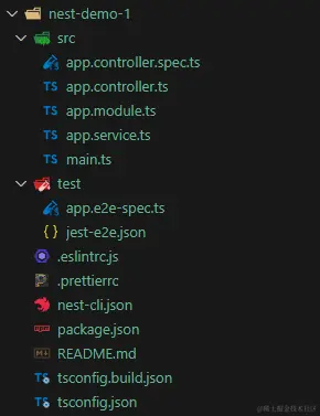 app.controller.spec.ts:测试文件,写单测的地方;app.controller.ts:控制器文件,负责处理传入的请求和向客户端返回响应;app.module.ts:根模块文件,所有的子模块都要通过它来引入;app.service.ts:提供功能服务的文件,负责数据的处理;main.ts:入口文件。
